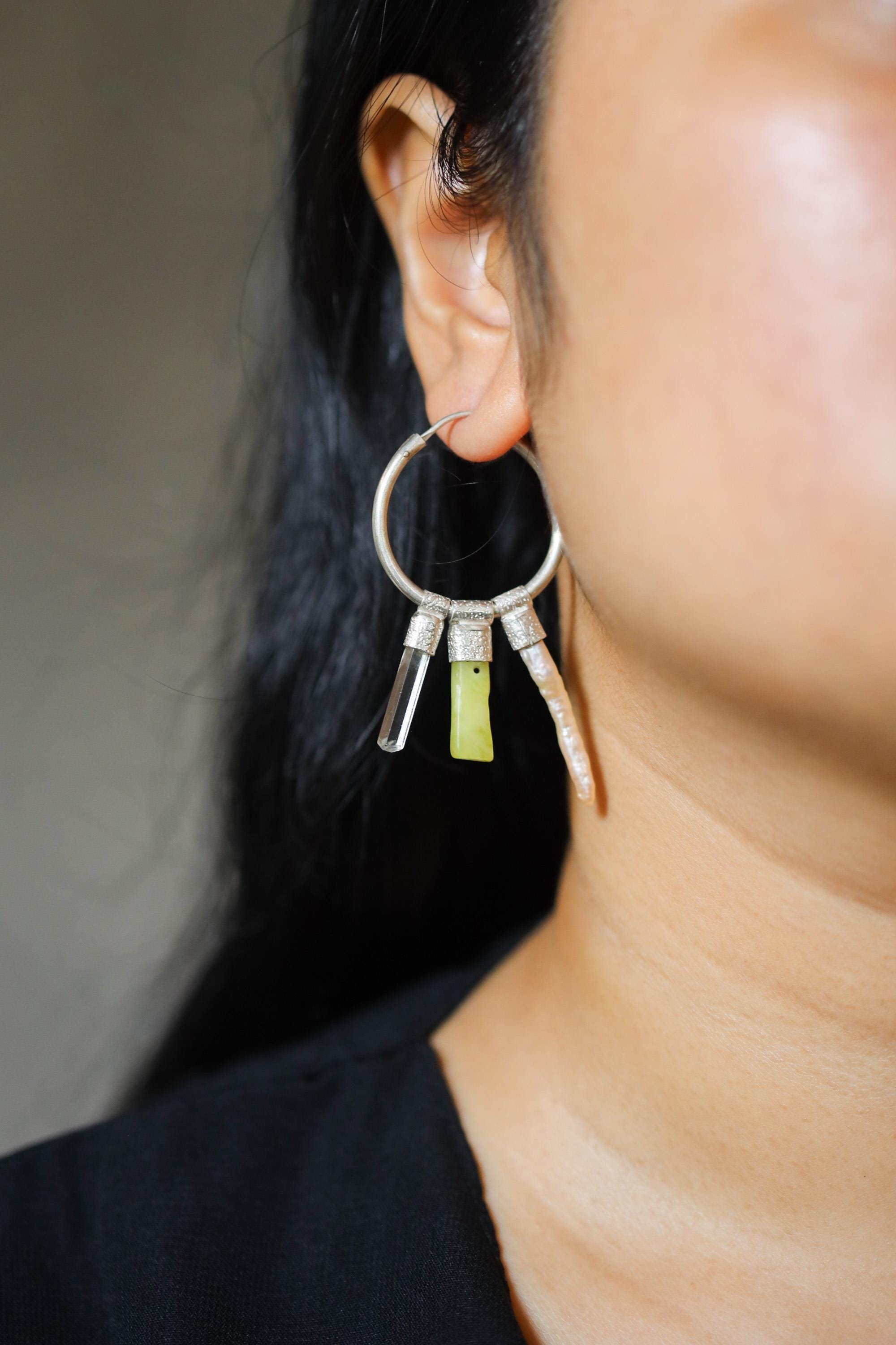 These Jade, Pearl, and Aquamarine Stack Pendant Earrings are crafted from sterling silver with a natural, hammer-textured finish. Featuring three stunning gemstones—jade, pearl, and aquamarine—set on large sterling silver hoops, these earrings embody elegance and spiritual meaning. With their multifunctional design, they can be worn as earrings or as pendants, making them versatile for any occasion.
