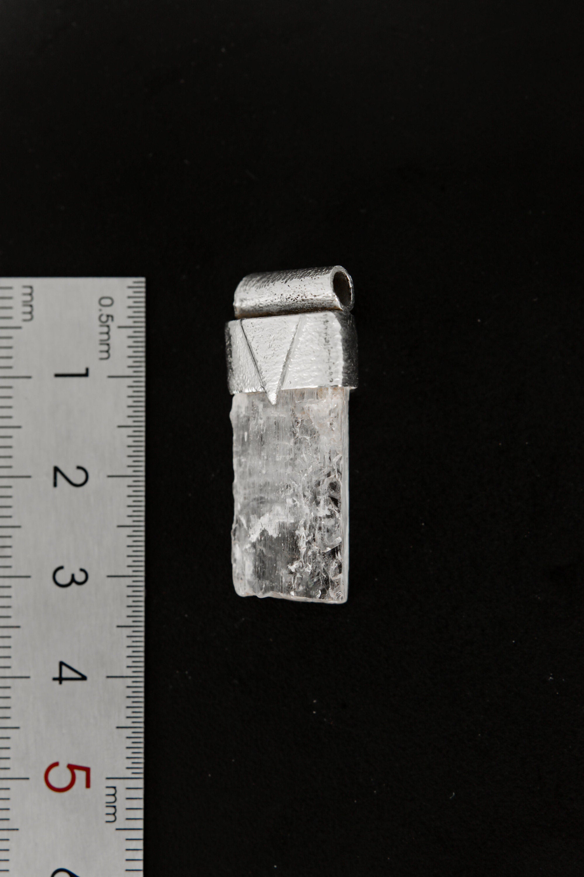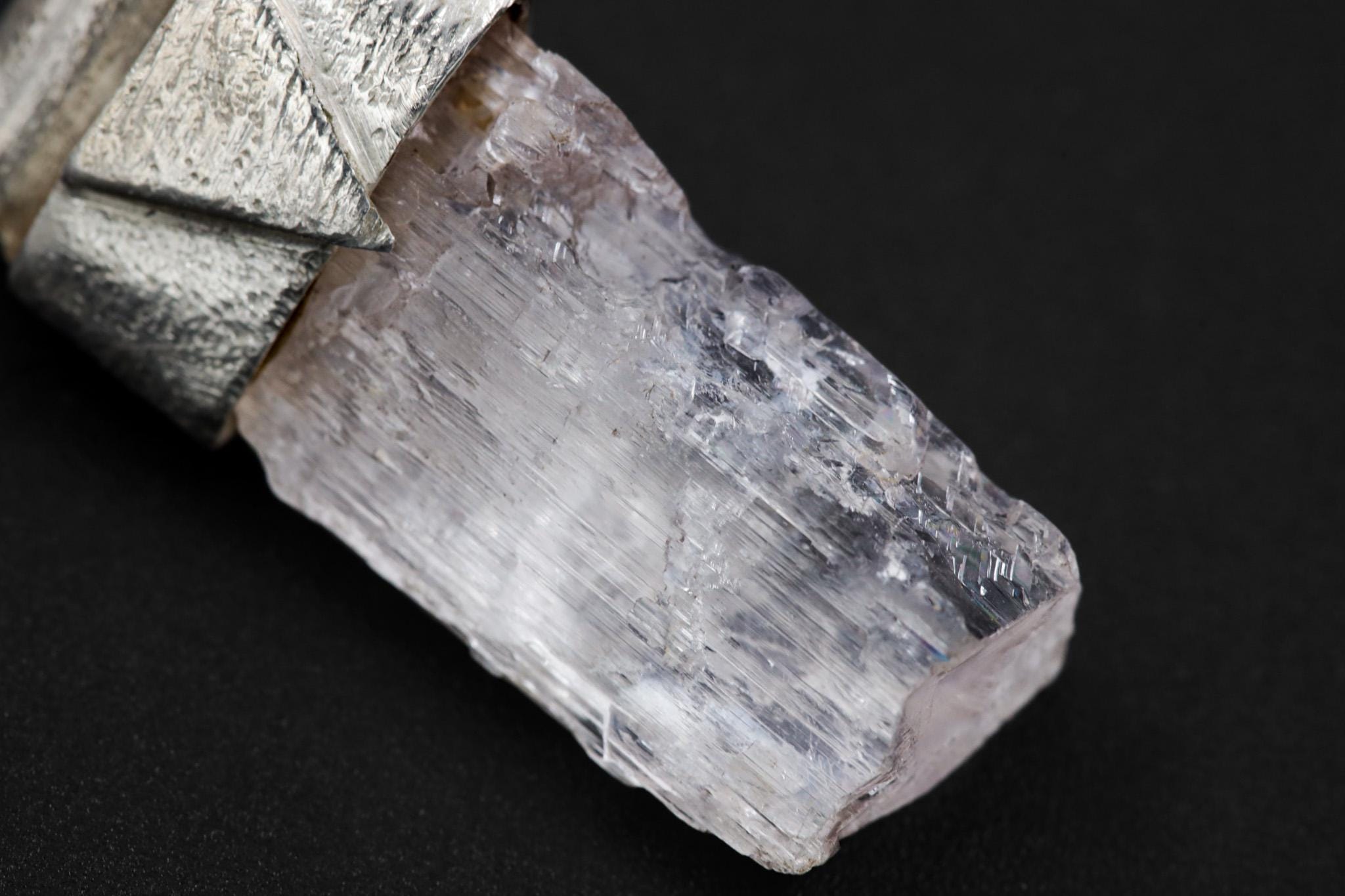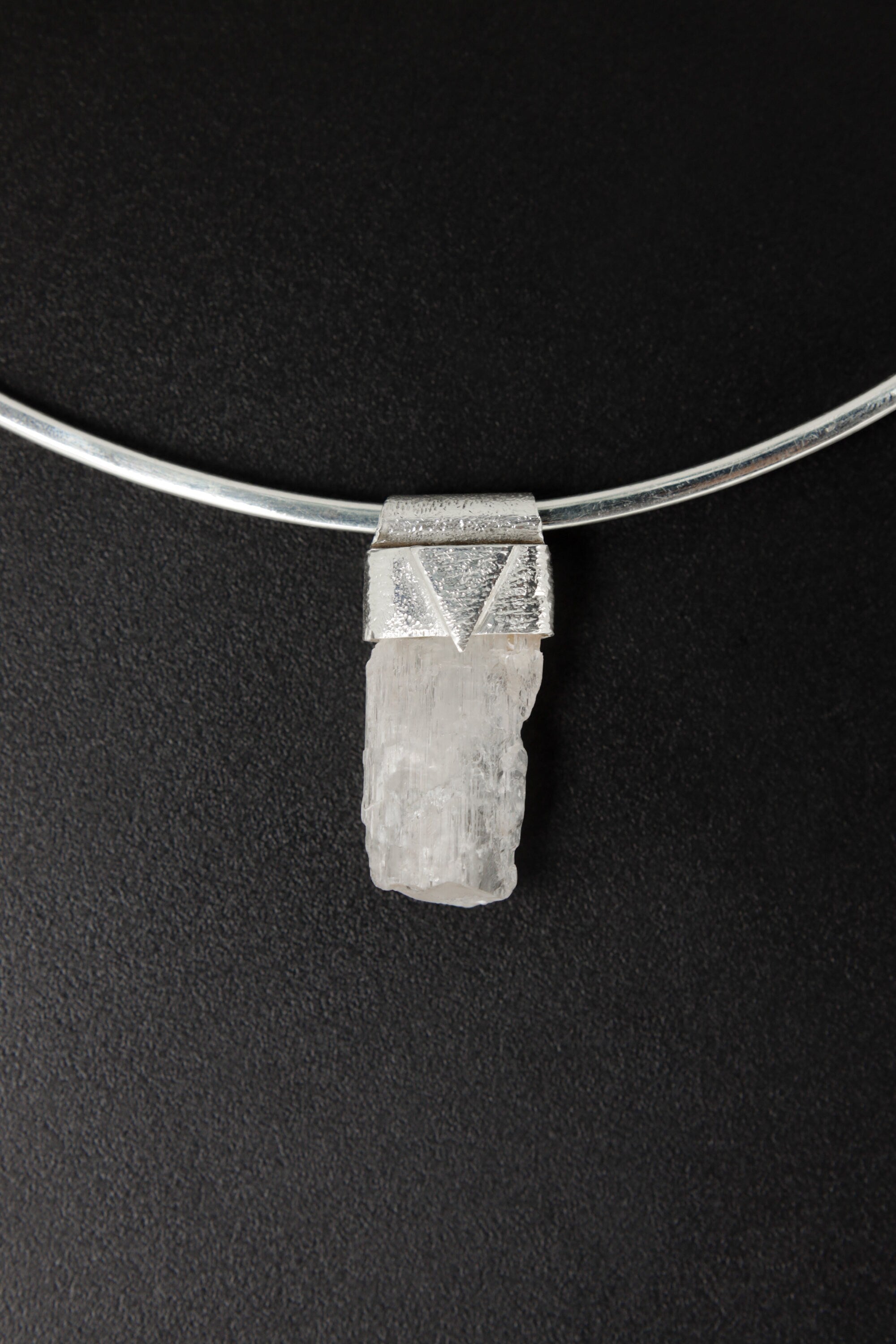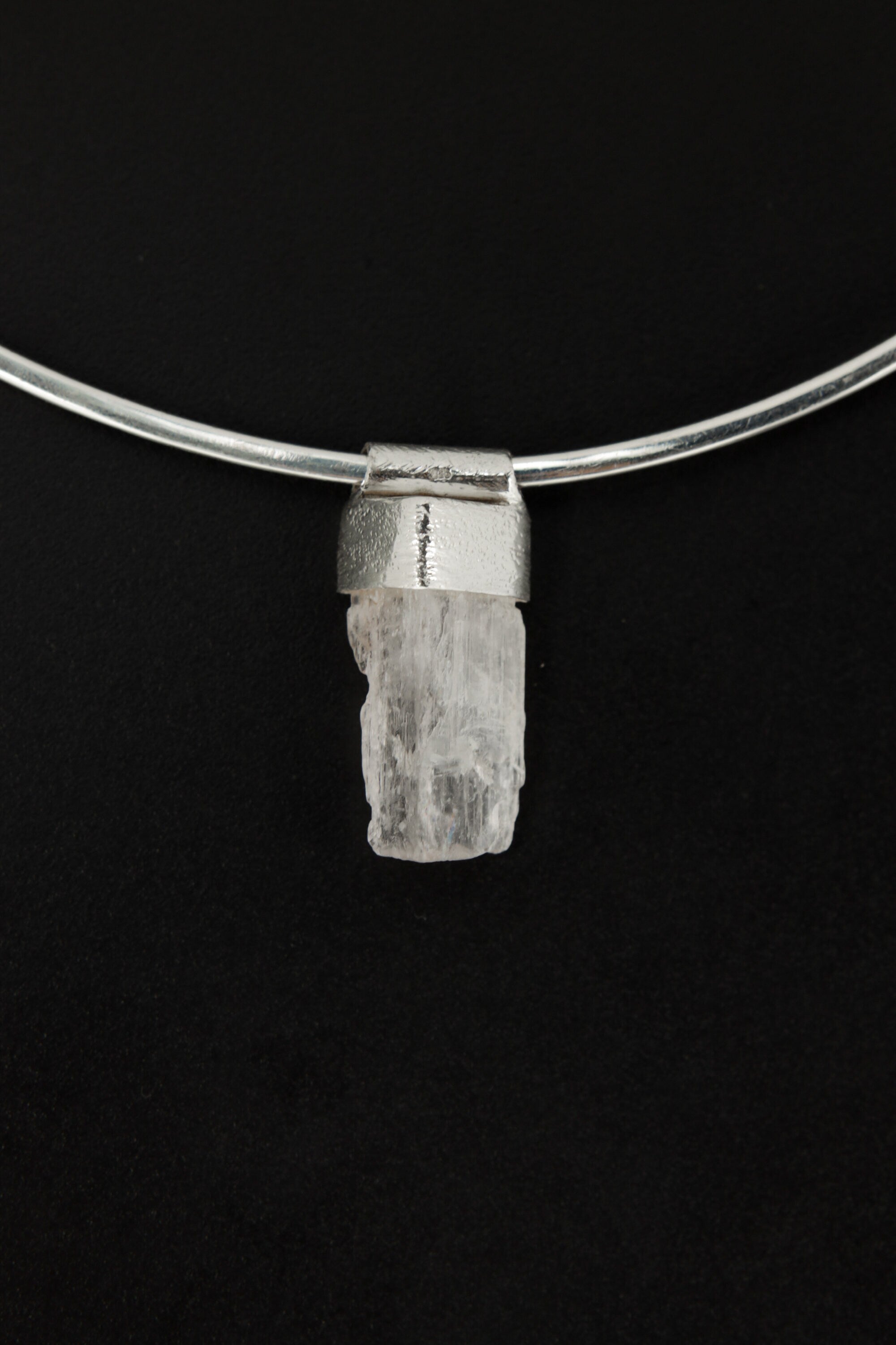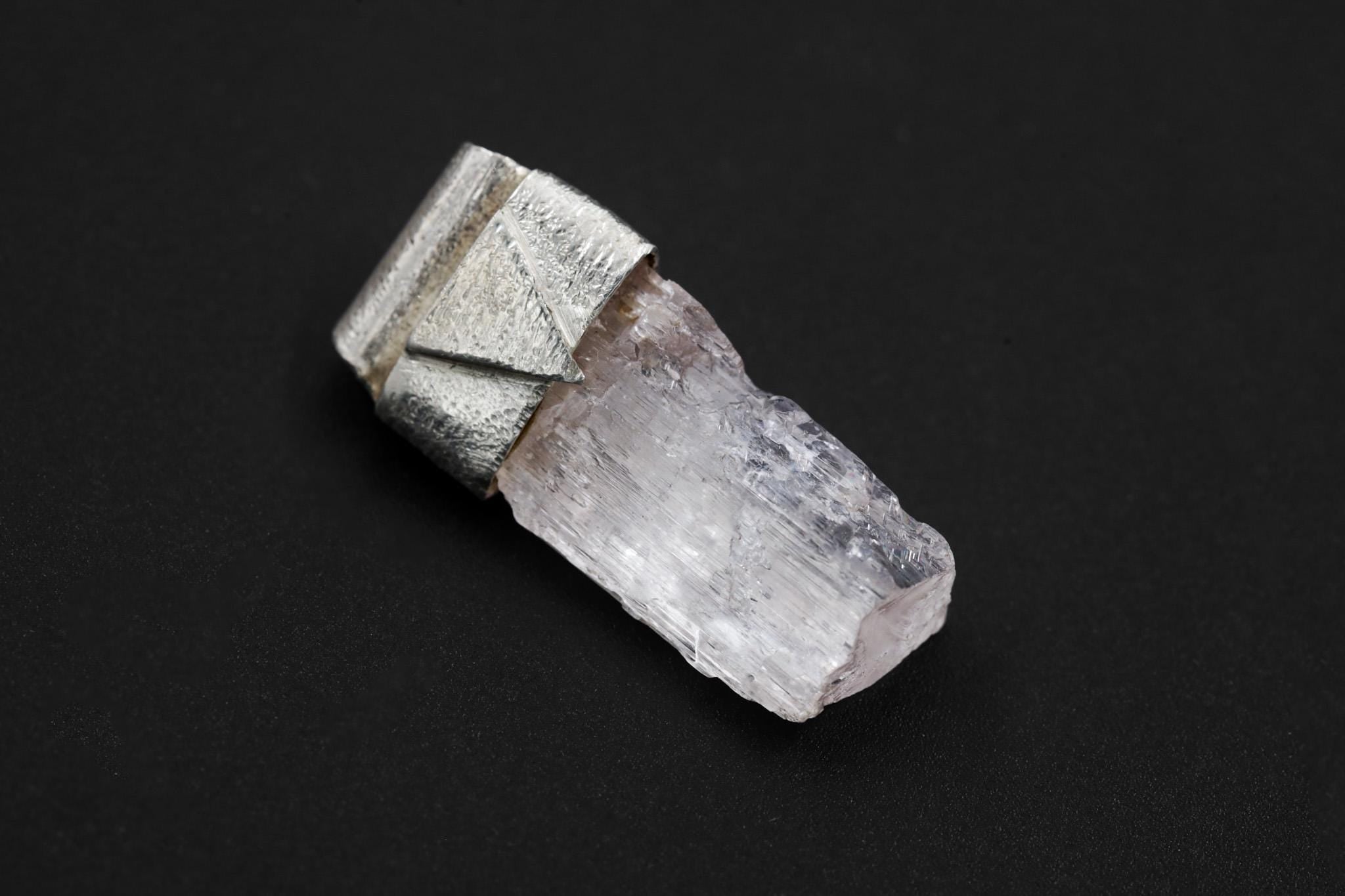 Add to your jewellery collection the delicate elegance of this raw Light Pink Kunzite Stack Pendant, featuring a naturally terminated crystal specimen with vertical striations and soft lilac-pink tones, hand-set in an organically textured sterling silver bezel cap. The pendant is finished with The Stonery’s signature silver triangle and a robust 3mm tubular bail. Measuring approximately 3.5 cm in length, this unique piece balances raw geometry and refined metalwork, ideal for layering or wearing solo as a statement of inner calm and gentle strength.