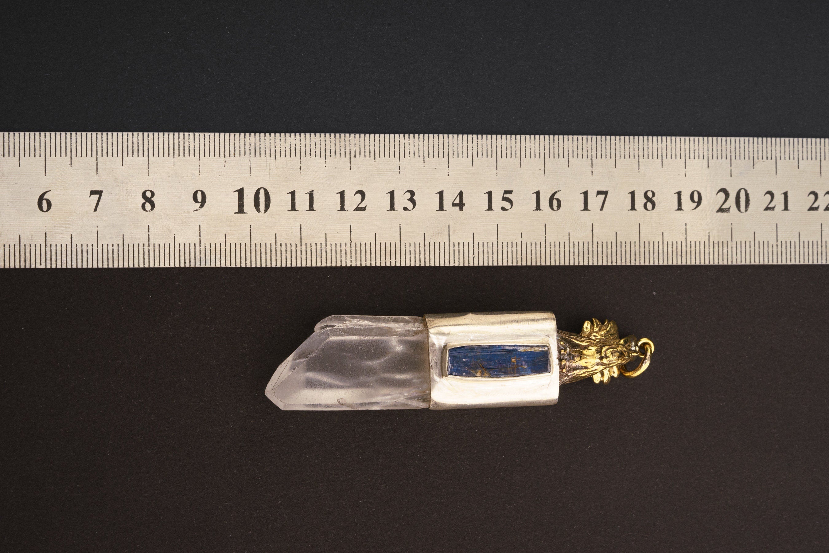 Himalayan Twin Quartz & Kyanite Pendant — Brass Rooster, Brushed Sterling Silver